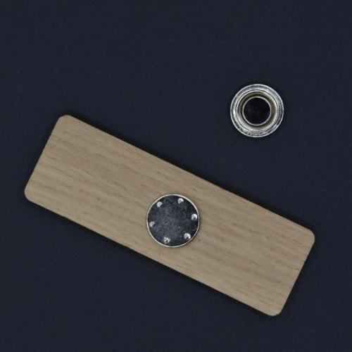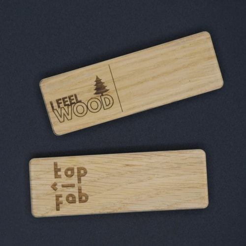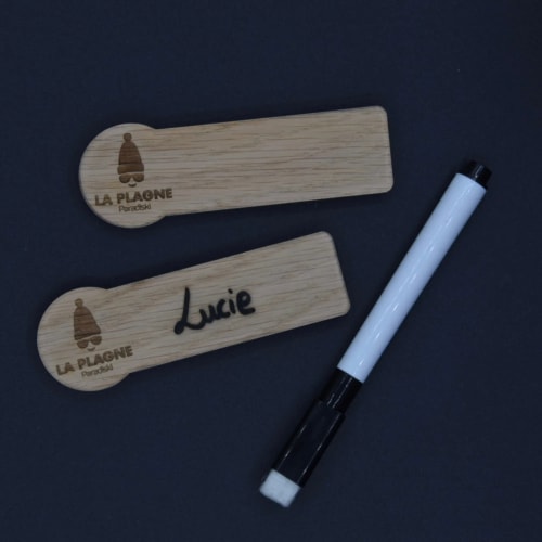 Badges en bois et plexiglass transparent fabriqués en France, 100% personnalisables avec votre logo, pour une communication originale et respectueuse de l'environnement grâce à sa partie effaçable !