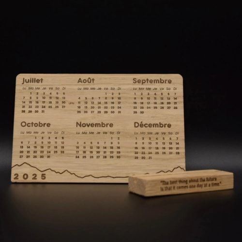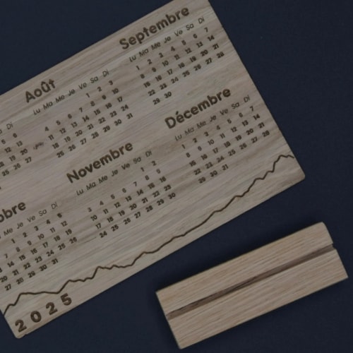 Misez sur l’élégance et la durabilité avec notre calendrier à poser en bois, un objet unique qui conjugue utilité et esthétisme. Conçu et fabriqué dans notre atelier en France, il est réalisé à partir de bois issu de sources responsables, gravé avec soin pour offrir un rendu raffiné et intemporel. Chaque détail est pensé pour mettre en valeur votre marque tout en reflétant vos engagements en faveur de l’environnement.