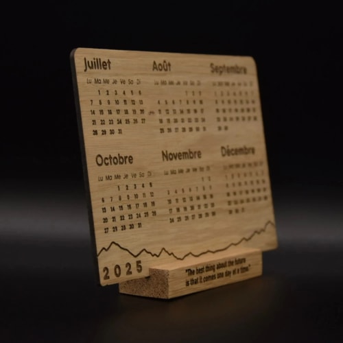 Pratique et compact, ce calendrier est idéal pour les bureaux, comptoirs ou espaces de travail. Sa conception en bois naturel en fait un accessoire décoratif qui s’intègre harmonieusement dans tout type d’environnement. Entièrement personnalisable, il peut être gravé avec votre logo, un design exclusif ou un message inspirant, vous permettant de communiquer de manière subtile et efficace tout au long de l’année.